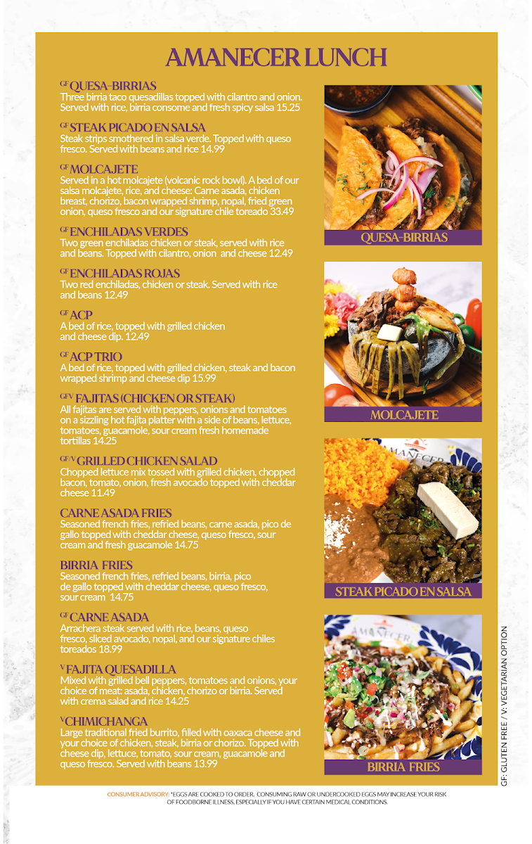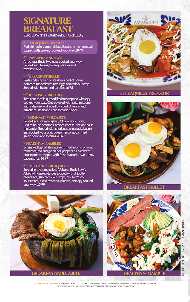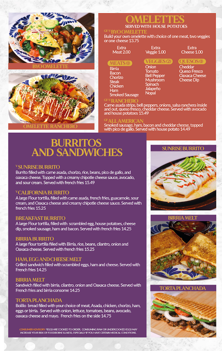 Carne asada strips, bell peppers, onions, salsa ranchera inside and out, queso fresco, cheddar cheese. Served with chiles toreados, avocado and house potatoes.