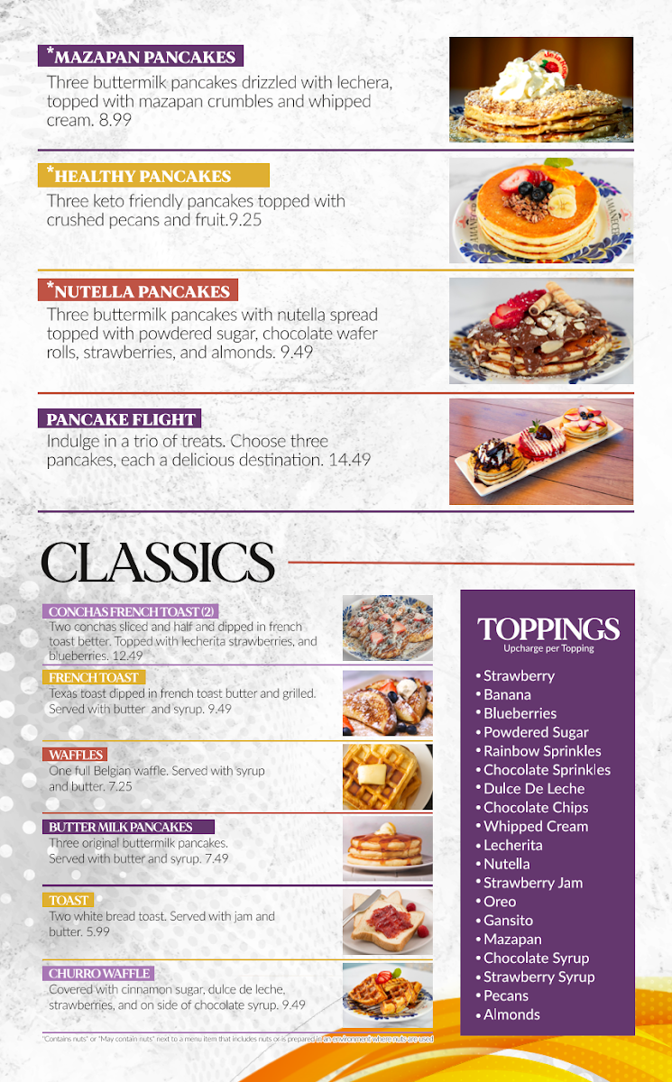 Two conchas sliced in half and dipped in french toast batter. Topped with lecherita, strawberries, and blueberries.