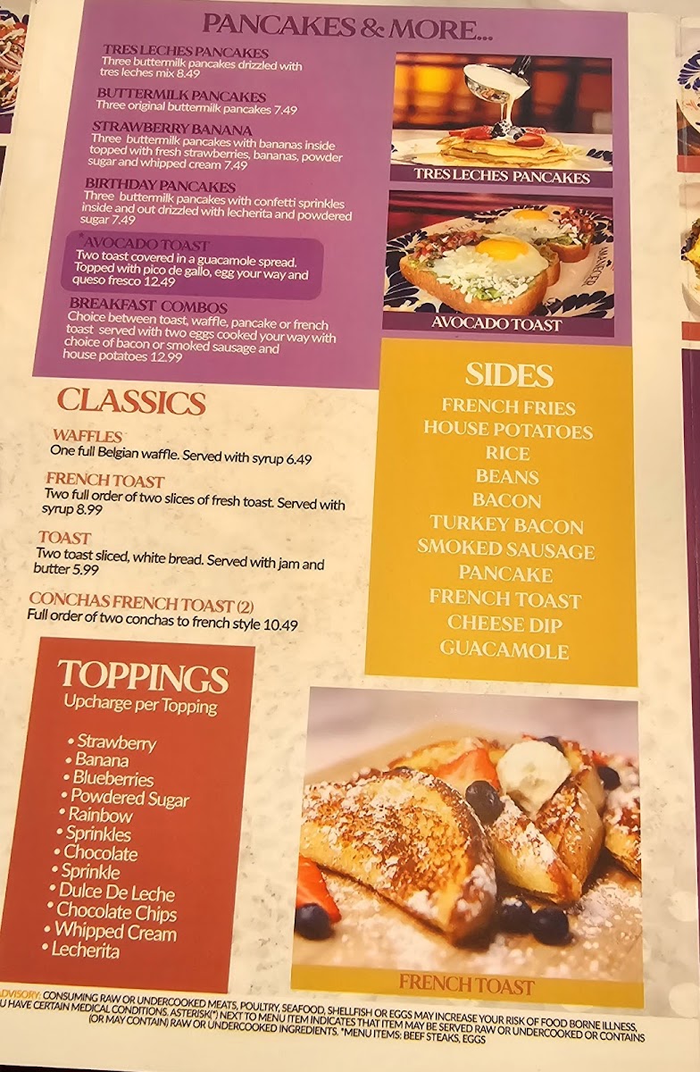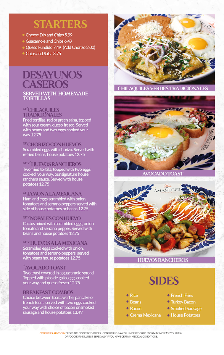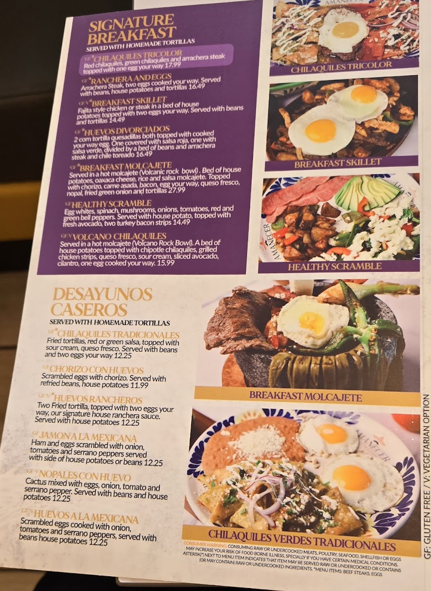 Fried tortillas, red or green salsa, topped with sour cream, queso fresco. Served with beans and two eggs.